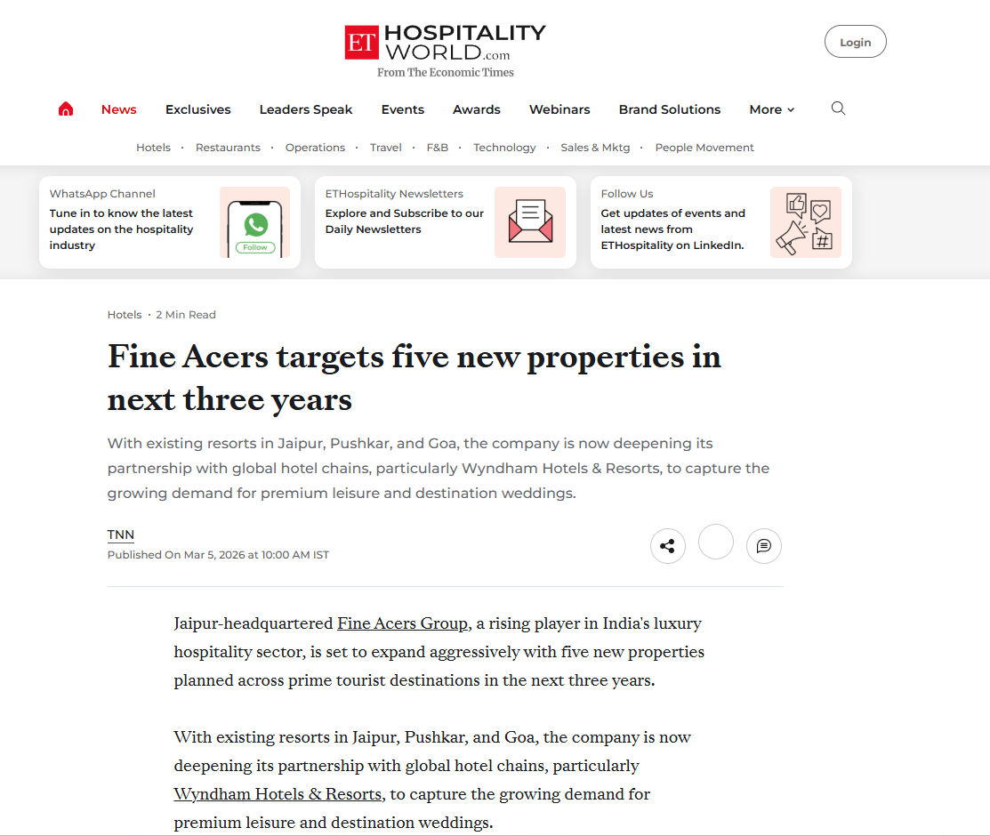 Wyndham Grand Jaipur Amer. This partnership merges Fine Acers' expertise in crafting world-class resorts with Wyndham's global hospitality excellence.